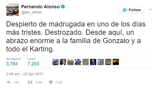 Информацията e дадена от Испанската федерация по автомобилизъм, която допълва, че се води разследване. Испански медии твърдят, че той се е ударил в друг карт, преобърнал се е и е останал затиснат от машината. В Twitter Алонсо заяви, че е "потресен" от инцидента.