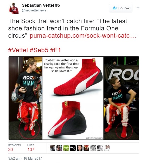 Себастиан Фетел ще стане първият пилот от Формула 1, който ще кара състезателен автомобил без традиционните специални обувки, твърди Auto Bild. Германецът ще се възползва от нова технология на Puma, партньор на Ферари. Четирикратният световен шампион ще замени още този уикенд в Русия обувките с чорапи, които са подсилени на необходимите места и вече получиха хомологация от Международната федерация по автомобилизъм.