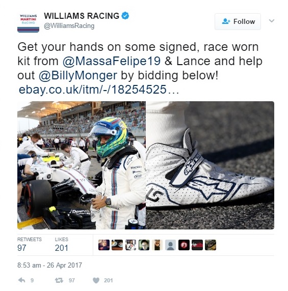 Дори повече от седмица след инцидента на "Донингтън парк" моторспорт обществеността продължава да се интересува и Ф1 отборът Уилямс ще продаде на търг в eBay състезателния костюм на Фелипе Маса и обувките на Ланс Строл от идния им уикенд в Русия, а парите ще отидат за лечениета на Били.