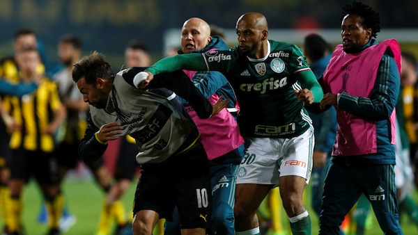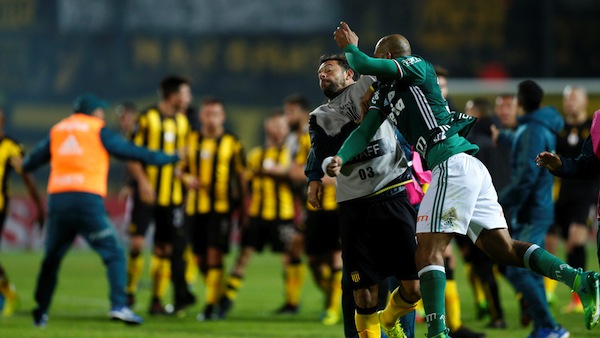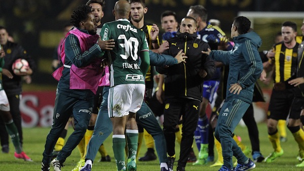 Грозни сцени белязаха края на мача между Пенярол и Палмейрас от турнира Копа Либертадорес. Бразилският тим спечели в Монтевидео с 3:2 мача между двата тима от Група 5 на турнира, но след последния съдийски сигнал опитният халф на Палмейрас Фелипе Мело предизвика масов, след като удари резервен футболист на уругвайците.
