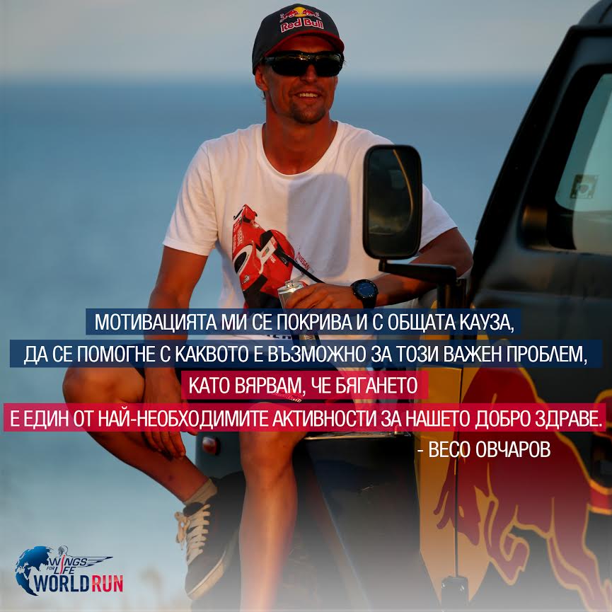 Шабан Мустафа и Веселин Овчаров за поредна година ще бъдат сред благодетелите на каузата. В миналогодишното издание на Wings for Life World Run Шабан Мустафа се включи в каузата, като бяга за тези, които не могат в Измир, Турция. Весо Овчаров пък е силно ангажиран към каузата и привлече към себе си приятели и отбора си Fly the Earth, с които бягаха заедно в Wings for Life World Run през 2015 година в Букурещ, Румъния.