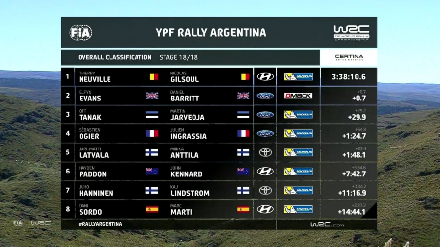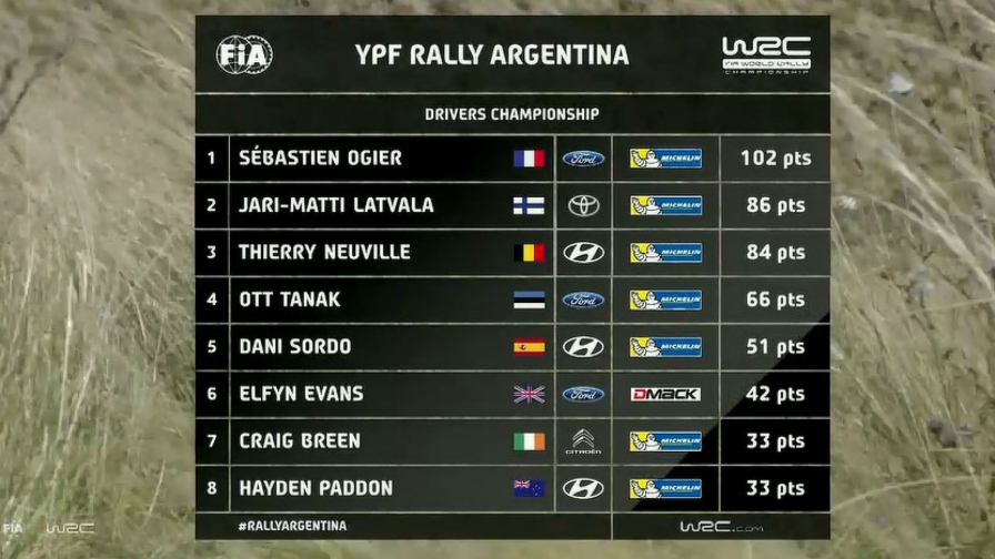 Победителят Нювил спечели и суперспециалния етап в Аржентина, което му донесе пет бонус точки, и така той се реваншира за неуспешния старт на сезона в Монте Карло и Швеция. Еванс взе четири точки от последния етап, а Танак, Себастиен Ожие и Латвала си разпределиха останалите точки.