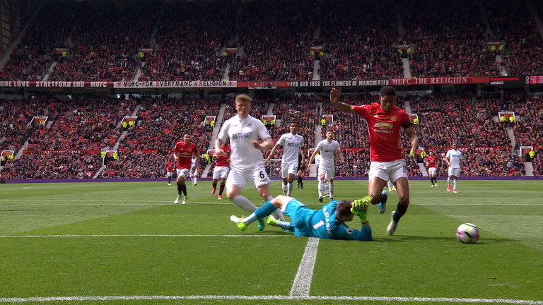 Маркъс Рашфорд се втурна в наказателното поле на Суонзи и, усетил опасността, вратарят на „лебедите” Лукаш Фабиански излезе бързо и се хвърли към него. Полякът обаче после дръпна ръцете си в последния момент и тогава нападателят, очаквал тежък сблъсък, реагира на промяната, като постави краката си към тялото на съперника и се гмурна към него.