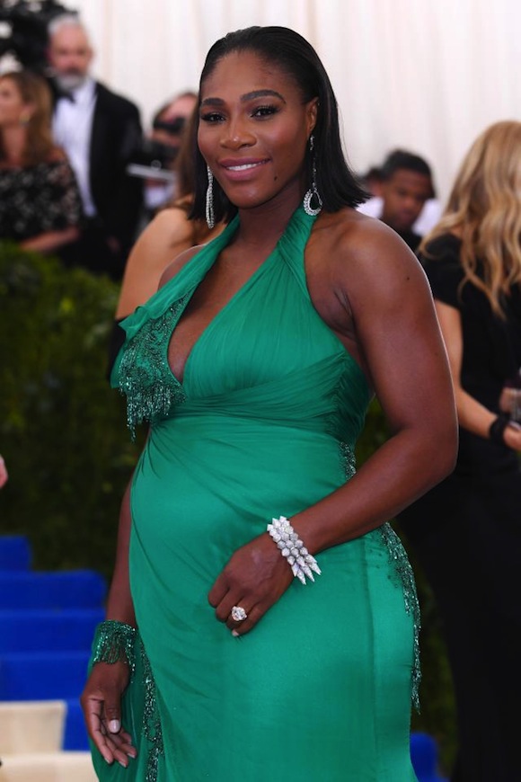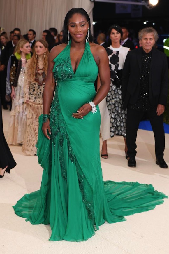 Американската тенисистка с удоволствие позираше пред фотографите, придържайки наедрялото си коремче, а модните критици побързаха да отбележат, че Серина е изглеждала възхително в своята зелена рокля с шлейф.