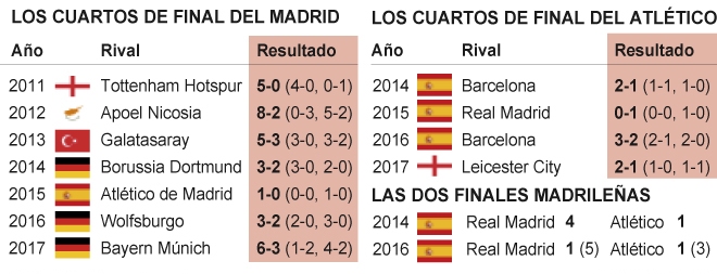 Първите нямат нищо против новата среща със своите съседи, въодушевени от добрите прецеденти в последните години (спечелени два финала и един четвъртфинал). А на Мансанарес предпочитат този сблъсък да е на полуфиналите, защото поражение в трети финал в рамките на четири години би бил вече напълно съкрушителен. Жаждата за реванш тежи по-малко от риска от трети крах срещу най-големия съперник в най-големия мач.
