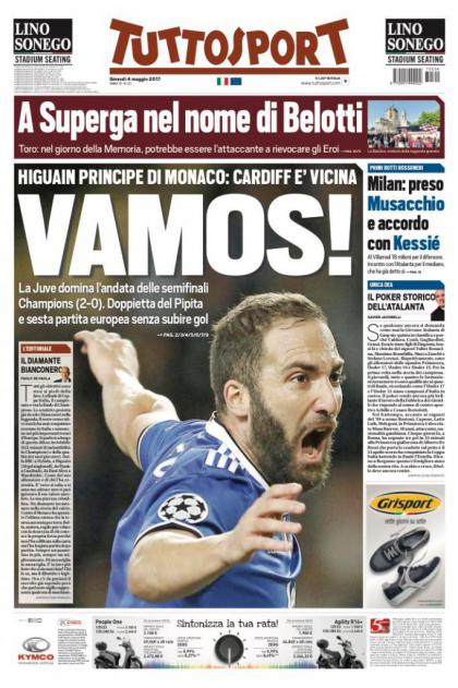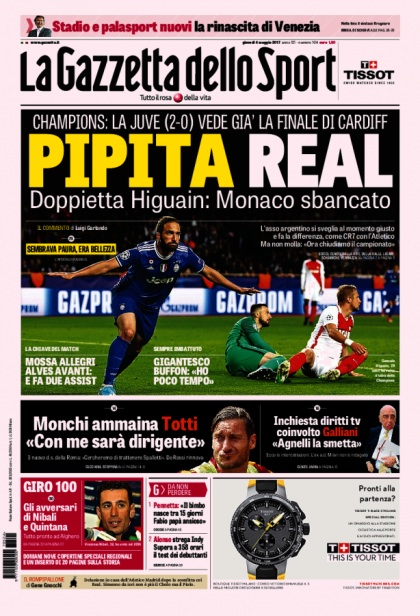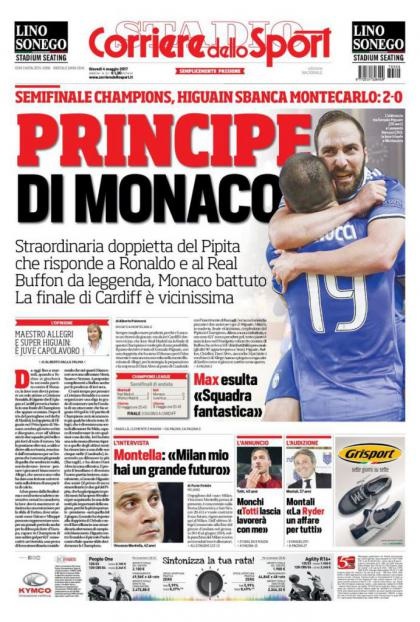 "Игуаин е Принцът на Монако", величае Corriere dello Sport на първа страница. "Изключителни попадения на Гонсало, който по този начи отговаря на Кристиано Роналдо. Финалът в Кардиф е близо", допълва изданието.