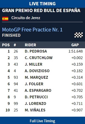 Първата свободна тренировка за неделната Гран При на Испания бе оглавена от пилота на Honda Дани Педроса, който се качи за първи път на подиума този сезон в предния кръг на "Остин". Той обаче не бе единственият състезател от тима, който финишира в челото на класирането при първия допир на MotoGP до Европа през новия сезон.