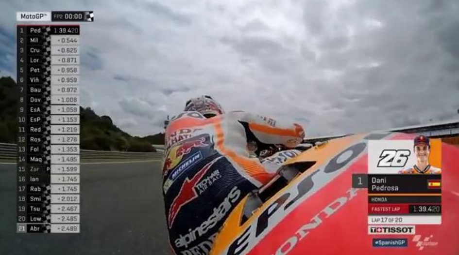 Дани Педроса с Honda бе най-бърз и във втората свободна тренировка от MotoGP на пистата "Херес", която бе съществено изсъхнала от сутрешната сесия. Испанецът зае върха с преднина от приблизително половин секунда спрямо втория пилот, отново с Honda – Джак Милър, като двамата бяха и единствените пилоти, чието време за обиколка падна под минута и 40 секунди.