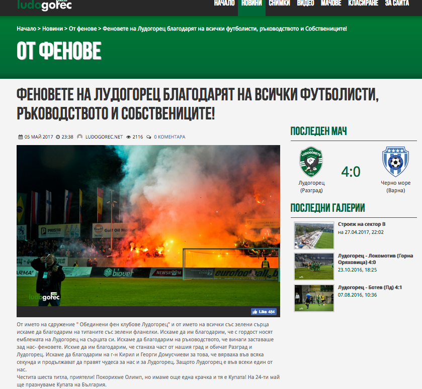 "От името на сдружение "Обединени фен клубове Лудогорец" и от името на всички със зелени сърца искаме да благодарим на титаните със зелени фланелки. Искаме да им благодарим, че с гордост носят емблемата на Лудогорец на сърцата си. Искаме да благодарим на ръководството, че винаги заставаше зад нас феновете. Искаме да им благодарим, че станаха част от нашия град и обичат Разград и Лудогорец. Искаме да благодарим на г-н Кирил и Георги Домусчиеви за това, че вярваха във всяка секунда и продължават да правят чудеса за нас и за Лудогорец. Защото Лудогорец е във всеки един от нас.