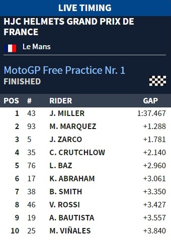 Родните любимци Йоан Зарко, Лорис Бас и Силван Жинтоли, който замества контузения Алекс Ринс, завършиха сесията на съответно трета, пета и 20-а позиции.