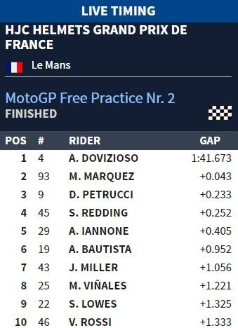Пилотът на Ducati Андреа Довициозо бе с най-смело каране и записа най-добрата обиколка по време на втората свободна тренировка от състезателния уикенд на MotoGP на "Льо Ман". След първата тренировка, провела се на суха писта, се появи дъжд, в резултат на което времената бяха доста по-слаби в сравнение със сутринта.