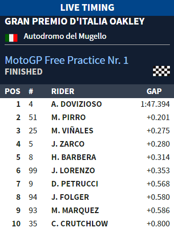 Пилотът на Ducati Андреа Довициозо бе най-бърз в първата свободна тренировка от състезателния уикенд на италианската писта "Муджело" в MotoGP. Той записа най-добрата обиколка за 45-минутната сесия в нейния край, а италианският тим може да се похвали и с второто място от нея. Тестовият пилот Микеле Пиро се справи чудесно с първата си поява от началото на сезона в шампионата, оглави за голяма част от времето тренировката и в крайна сметка отстъпи единствено на съотборника си.