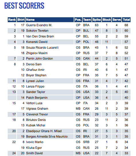 Пред него в класацията е само олимпийският шампион с Бразилия от Рио 2016 Евадро Гера, който е реализирал 68 точки (63 атаки, 4 аса, 1 блок). На трето място е белгиецът Брам Ван Ден Дриес с 569 точки.
