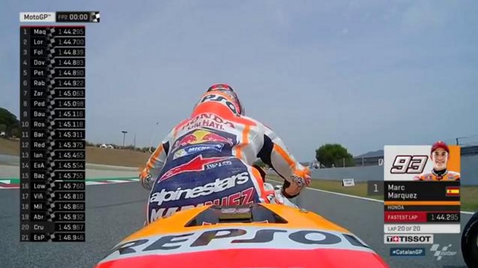 Световният шампион на MotoGP Марк Маркес бе недостижим в първите две свободни тренировки от състезателния уикенд в Барселона, оглавявайки и втората сесия. Следобед пистата бе напълно суха, а след първите минути Лоренсо бе най-бърз, преди Маркес, Яноне и Довициозо да подобрят времето му.