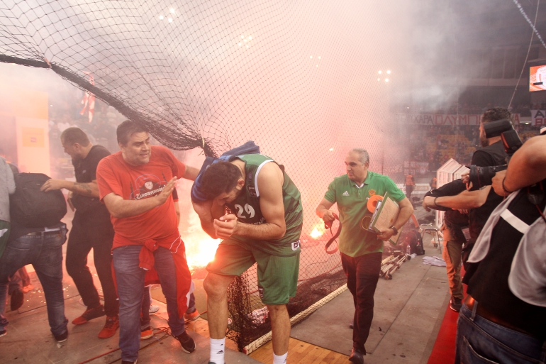Запалянковците на “червено-белите” показаха несдържания си характер в последните 120 секунди преди финалната сирена, когато при резултат 66:49 в полза на ПАО, започнаха да обстрелват пейката на гостите с бомби и факли. Тези сцени доведоха до кратко прекъсване на двубоя, докато може хаотичната атмосфера да бъде овладяна поне за кратко.