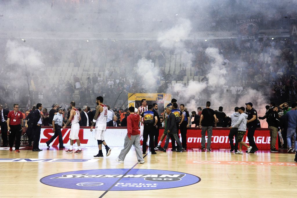 Дербитата между тези два тима винаги са нажежени до краен предел, а напрежението е изключително високо. Петият мач не правеше разлика в това отношение, а развитието му не се хареса на феновете на домакините от Олимпиакос, които прекъснаха срещата около две минути преди края, когато вече се виждаше, че любимците им няма как да заличат изоставането от вечния си враг. Гостите бяха по-добрият отбор и контролираха развоя на мача от начало до край, а в един момент дори водеха с 20 точки (57:37).