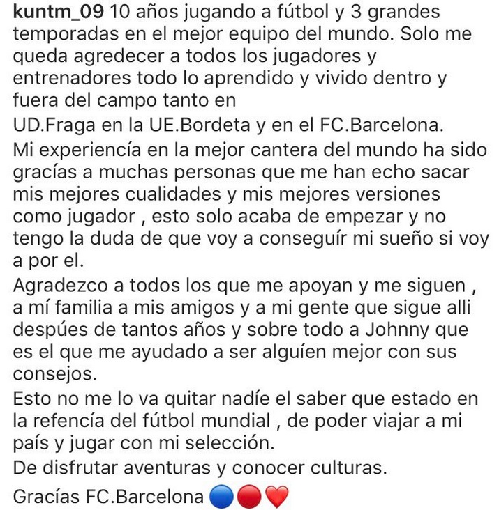 Българският футболен талант Кун Теменужков напусна детско-юношеската школа на Барселона и от новия сезон ще има нов клуб. 17-годишният нападател се сбогува с Ла Масиа с емоционално съобщение в социалните мрежи. "10 години футбол и 3 страхотни сезона в най-добрия отбор в света. Мога само да благодаря на всички играчи и треньори за всичко научено на и извън терена. Преживяването ми в най-добрата школа в света се получи благодарение на много хора, които ми помогнаха да покажа най-добрите си качества като футболист. Нямам никакви съмнения, че ще постигна мечтата си, щом се стремя упорито към нея", написа той.