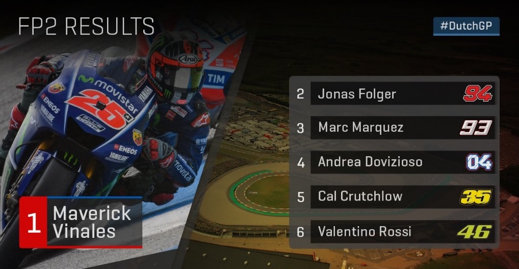 Временният лидер в MotoGP Маверик Винялес записа най-добрата обиколка във втората свободна тренировка от състезателния уикенд в Холандия. В първата сесия сутринта той завърши едва 12-и, но следобед се изтреля на върха с време 1:33.130 минути. Катастрофиралият сутринта Йонас Фолгер остана втори с пасив от 0.367 секунди.