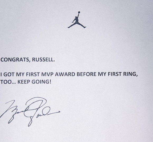 “Поздравления, Ръсел! Аз също спечелих първото си MVP преди първата си титла. Продължавай!”, гласи краткото обръщение на Ем Джей, който има шест трофея “Лари О’Брайън” с екипа на Чикаго. 54-годишната легенда триумфира за първи път като шампион на Лигата през 1991 година, а три сезона по-рано (1987/1988) грабна най-ценната индивидуална награда за първи път.