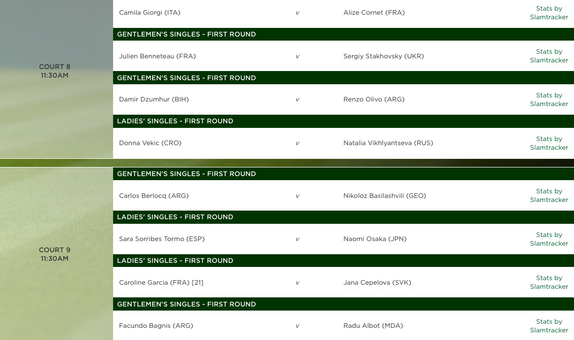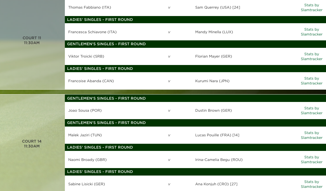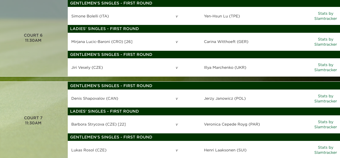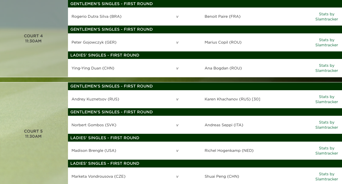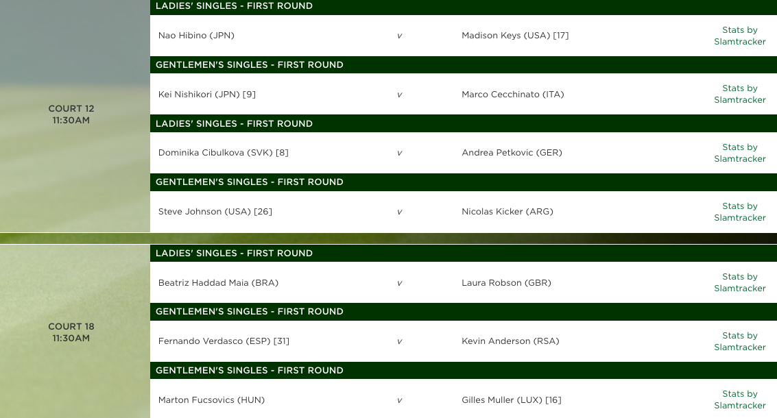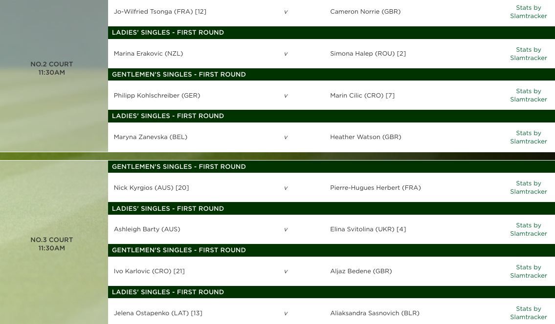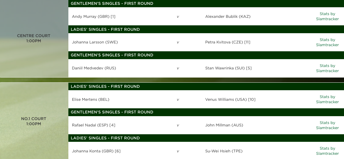 Рафаел Надал ще се изправи срещу Джон Милман във втория мач на корт номер 1, където преди това Винъс Уилямс ще играе с Елизе Мертенс, а в третия двубой Йохана Конта излиза срещу Су-Вей Хсие.