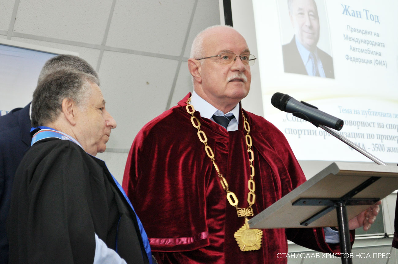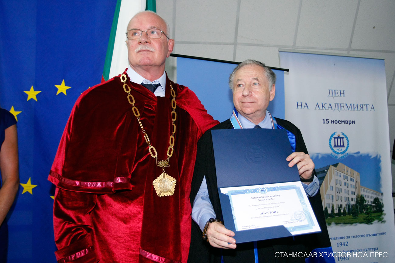 Президентът на Международната автомобилна федерация (FIA) Жан Тод бе удостоен с титлата Доктор хонорис кауза на Национална спортна академия "Васил Левски" на тържествена церемония в Аула "Максима" на спортната академия.