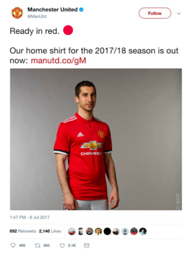 Английският гранд Манчестър Юнайтед се видя принуден да изтрие свой собствен “туийт”, показващ как една от звездите на тима - арменският офанзивен халф Хенрих Мхитарян, позира с новия екип на “червените дяволи”. Шампионът в Лига Европа прибегна до това действие в резултат на множество коментари на футболни фенове по адрес на изглеждащия на снимката с наднормено тегло играч. Сред коментарите не липсват и такива, че 28-годишният Мхитарян изглежда “бременен”, отбелязват медиите на Острова. Очевидно арменецът ще трябва да положи усилия, за да бъде в приемлива за професионален футболист форма за началото на новия сезон.