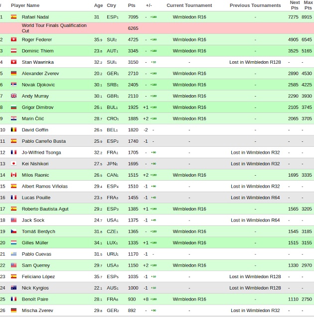 Димитров и 20-годишният Зверев на практика избутват от Топ 10 канадеца Милош Раонич и французина Жо-Вилфред Цонга. Докато Цонга вчера отпадна от надпреварата след петсетово поражение от американеца Сам Куери, то Раонич намери място във втората седмица, но задачата му да се задържи в Топ 10 е доста трудна. Канадецът има да защитава много точки, тъй като миналата година достигна до финала, в който отстъпи пред Анди Мъри. Любопитното е, че съперник на 1/8-финалите на Раонич ще бъде именно Зверев. Това означава, че един от преките конкуренти на Димитров за място в десетката ще приключи участието си на "Уимбълдън" в понеделник и ще отвори широко вратата пред българина за влизане в Топ 10.