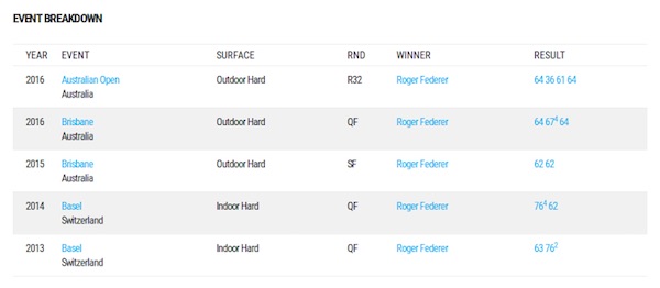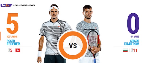 Всъщност 26-годишният Димитров има една победа срещу Федерер. Тя обаче не влиза в официалната статистика. През март 2015 година българинът надделява над швейцареца с 6:2, 1:6, 7:5 в демонстративен мач в легендарната зала "Медисън Скуеър Гардън" в Ню Йорк.