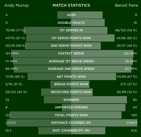 Шотландецът зарадва феновете на централния корт веднага след като Йохана Конта се бе превърнала в първата британка на четвъртфинал на “Уимбълдън” от 1984 година насам. Мъри може да се похвали с 23-о класиране на четвъртфинал от последните си 25 участия в събития от Големия шлем. Световният номер 1 не предложи нещо феноменално на корта, но пък може заслужено да се похвали с десети пореден четвъртфинал на “Уимбълдън”, като в историята само Джими Конърс (11, 1972-1982) може да се похвали с повече, а Роджър Федерер също е с десет до 2012 година.