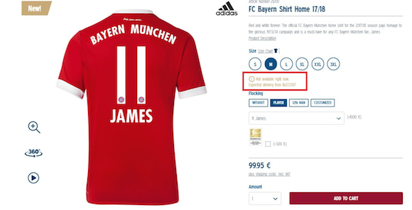 Само за един ден запалянковците на Байерн (Мюнхен) изкупиха всички налични фланелки с името на новото попълнение Хамес Родригес в онлайн магазина на клуба. Изчерпани са всички размери, а нова доставка ще има на 16 юли. Екипът струва 99,95 евро. В същото време фланелките на нито един от другите футболисти не са разпродадени.