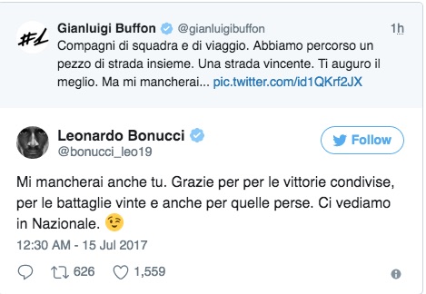 Капитанът на Ювентус Джанлуиджи Буфон и бившият защитник на тима Леонардо Бонучи си размениха патетични думи в социалните мрежи. Най-напред вратарят на "Старата госпожа" пожела всичко добро на Бонучи, който изненадващо напусна клуба в посока Милан със статус в Туитър.