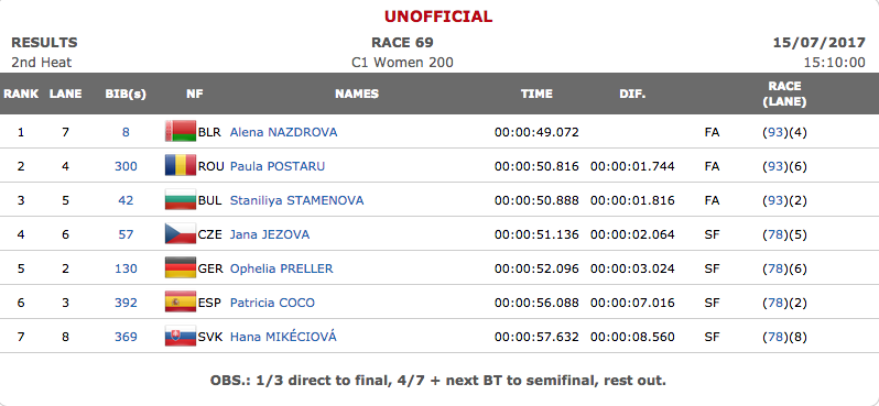 Победителка в нейната серия стана представителката на Беларус Алена Наздрова с 49.072 сек.