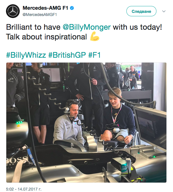 Този уикенд в гаража на Мерцедес освен обичайните знаменитости, ще присъства и един герой. Били Монгър - момчето, което оцеля след ужасяваща катастрофа във Формула 4 през април, но изгуби долната част на краката си, е специален гост на Люис Хамилтън.