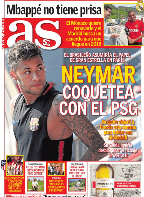 Най-четеният вестник на Иберийския полуостров Marca поставя огромна снимка на Ней Джуниър на първата си страница. До неговото лице е изписана умопомрачителната сума от 222 милиона евро и цифрите по предложения договор - 30 милиона за всяка една от петте години. Другият популярен мадридски вестник AS също публикува голяма снимка на бразилеца с челно заглавие: “Неймар флиртува с ПСЖ”. Според изданието бащата на футболиста ще пътува до Париж тази седмица, за да разговаря с президента Ал-Келаифи. AS смята, че ако сделката се осъществи, това може да помогне на Барса да се сдобие с така желания Марко Верати.