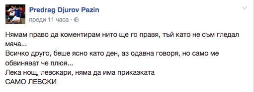 "Нямам право да коментирам, нито ще го правя, тъй като не съм гледал мача... Всичко друго беше ясно като бял ден, аз одавна говоря, но само ме обвиняват че плюя... Лека нощ, левскари, няма да има приказка. САМО ЛЕВСКИ!", написа Пажо.