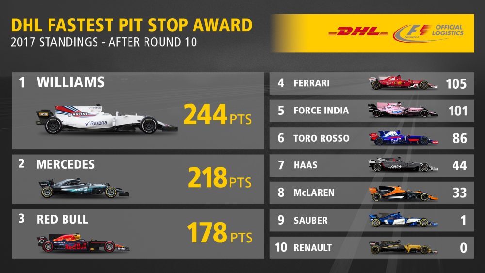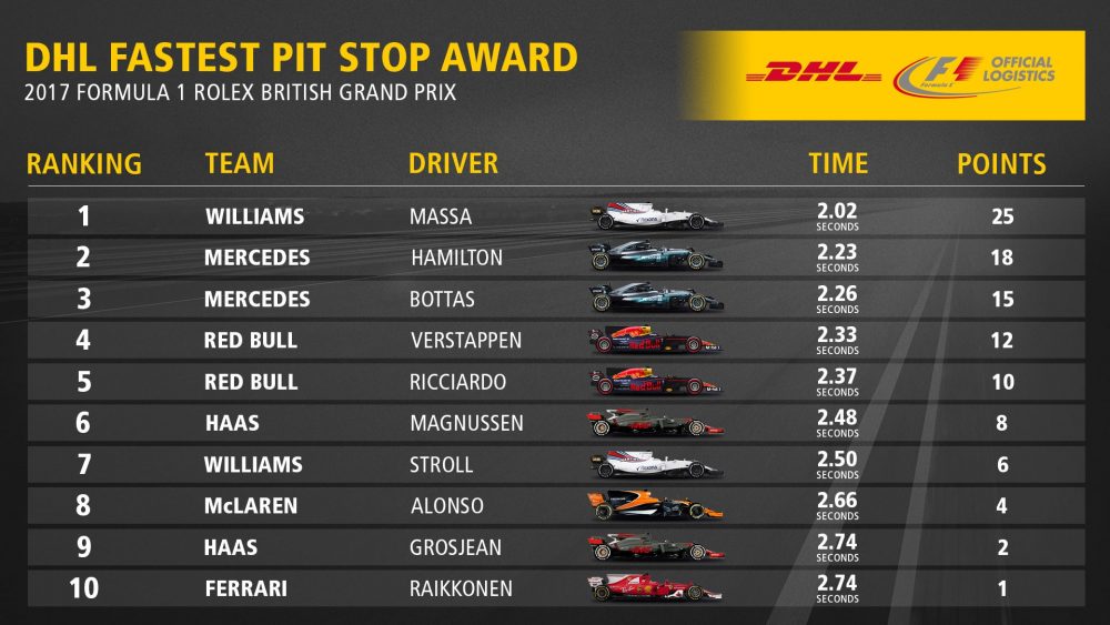 Световните шампиони при конструкторите Мерцедес също направиха най-добрия си питстоп на Острова, но той е с две десети по-бавен от този на конкуренцията. Нормално, Уилямс държат и комфортна преднина в класирането за най-бърз питстоп на DHL за 2017-а.