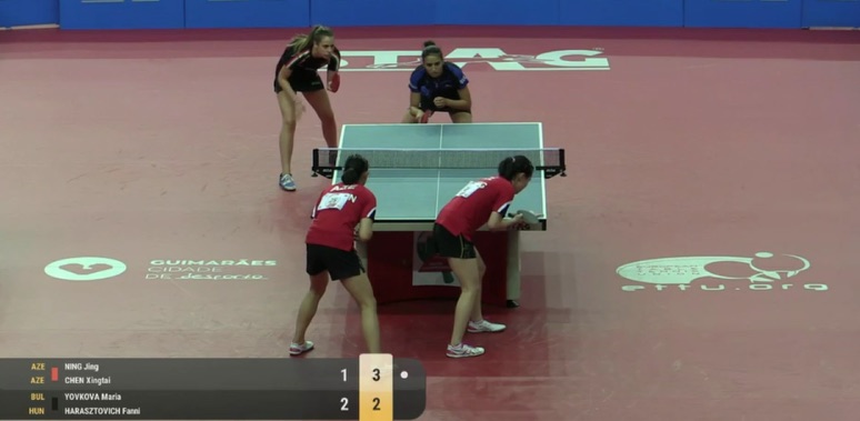 Йовкова и Харастович изиграха отличен мач. В първия гейм те бяха безапелационни и стигнаха до успеха с 11:6. Вторият гейм започна точка за точка, но постепенно представителките на Азербайджан установиха надмощие и го взеха с 11:7. Последва бърз трети гейм и успех за Йовкова и Харастович с 11:2. В четвъртия двете отстъпиха с 11:5 и се стигна до решаващ пети гейм за златните отличия.