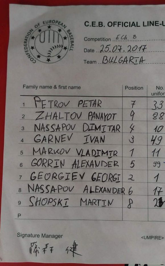 Именно първата защита се оказа пагубна за българския отбор, който пусна 9 точки, преди да направи 3 аута. Във вчерашния откриващ мач срещу Австрия "лъвовете" също изостанаха с 0:9 рано-рано – във 2-рия ининг, а накрая бяха нокаутирани с 2:15 в 7-ия. Двете точки на честта днес вкараха появилият се по спешност като резервен питчер Теодор Димитров – с инфилд хит в 4-тия, и вторият бейзмен Димитър Насъпов – със саможертвен флай в 5-ия.