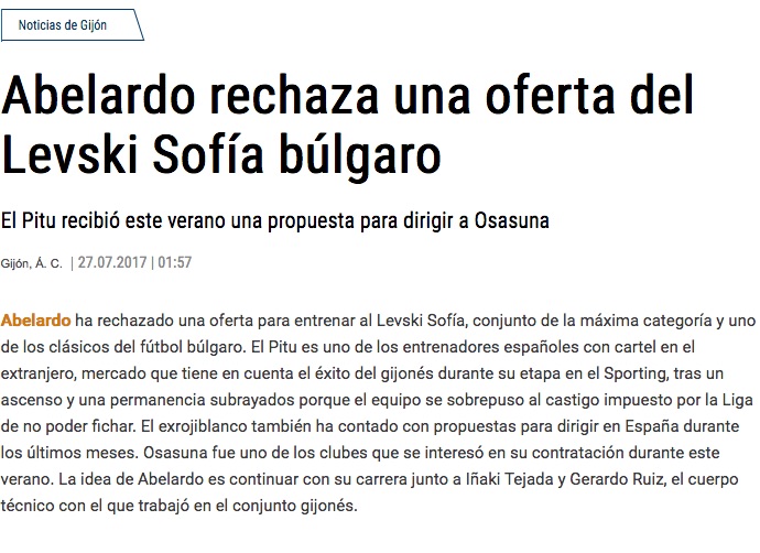 Информациите, че Левски усилено търси нов треньор продължават. Днес испанското издание “La Nueva Espana” разкри, че бившият съотборник на Христо Стоичков в Барселона - Абелардо, е отказал да поеме сините.
