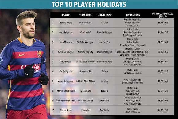 Истински Магелан се оказа капитанът на Барселона Жерар Пике. Според класация на “Сън” защитникът е навъртял 29 163 мили (около 46 000 км) по време на лятната си ваканция. Пике и любимата му Шакира почиваха в Росарио (Арж), Бейрут (Лив) и Доха (Катар).