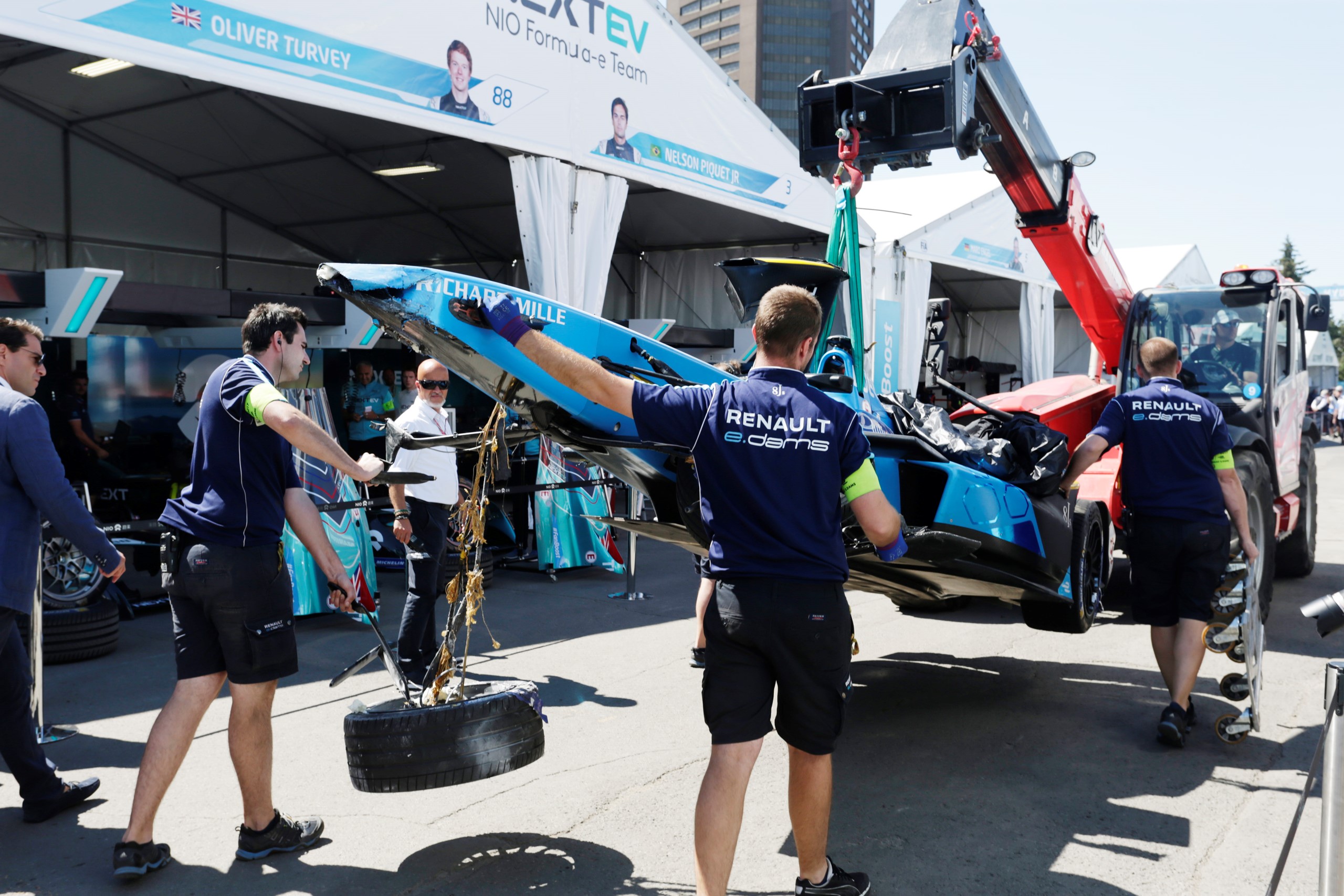 Пилотът на Рено във Формула Е Себастиен Буеми претърпя ужасяваща катастрофа по време на тренировка за вчерашната Гран При на Монреал в електрическия шампионат. Швейцарецът се удари в стената на уличното канадско трасе с висока скорост, от което предницата на състезателния му автомобил бе неузнаваема.