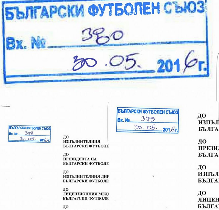 Той е публикувал и входящите номера на три документа, които са заведени в БФС на 30 май с входящи номера 378, 379 и 380. Те са адресирани до президента и изпълнителните директори на БФС, лицензионния мениджър и лицензионната комисия.