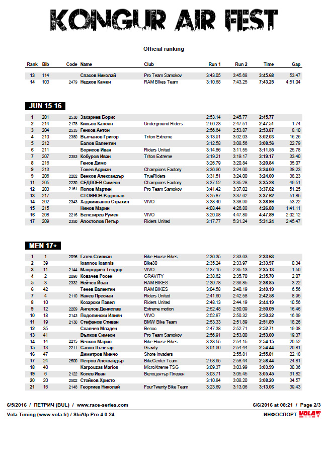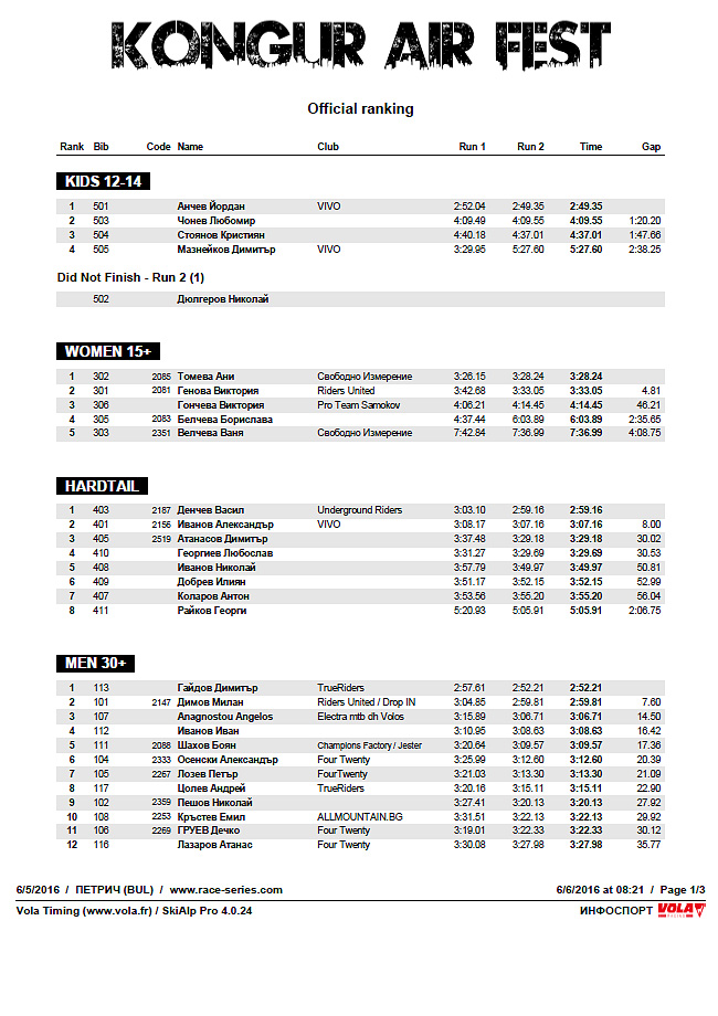 Ани Томева oт "Свободно измерение" е номер едно при дамите. Следват я Виктория Генова от Riders United и Виктория Ганчева от Pro Team Samokov. В категорията хардтейл Васил Денчев се класира пред Александър Иванов и Димитър Атанасов, а при участниците над 30 години най-предните места заемат Димитър Гайдов от True Riders, Милан Димов от Riders United / Drop IN и Ангелос Анагносту от Electra mtb dh Volos.