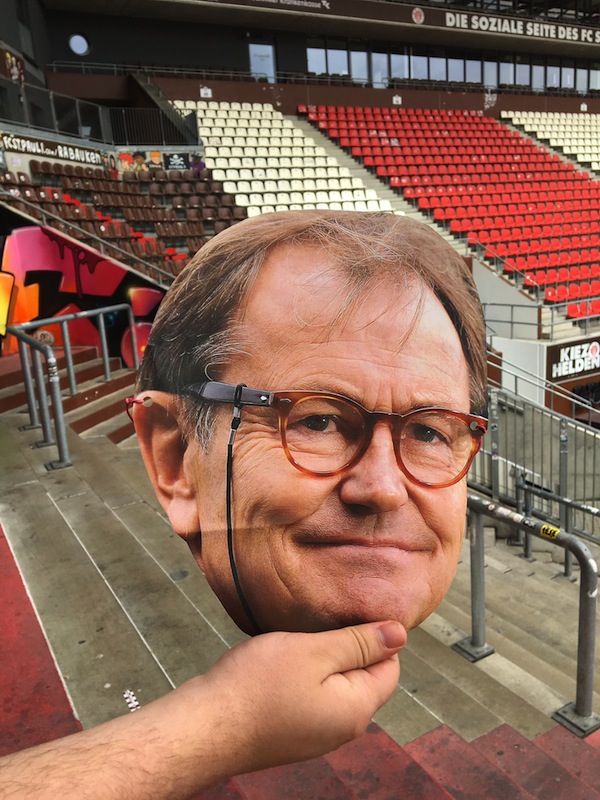 Втородивизионният германски клуб Санкт Паули намери оригинален начин да представи свое ново попълнение, прикривайки отсъствието от събитието на страши треньора на тима Евалд Линен. Наставникът не успя да вземе участие в представянето на 22-годишния нападател Марвин Дукш и вместо него за снимка с играча позира друг човек, носещ маска с лицето на треньора. Клубът си призна за използвания трик и публикува в официалния си профил в Twitter и снимка на самата маска.