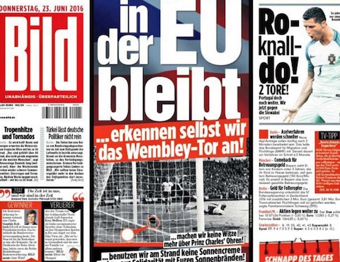 В Германия са сериозно притеснени от вероятността Великобритания да напусне Европейския съюз и правят всякакви обещания, за да принудят избирателите да гласуват за оставане в съюза на днешния референдум. От Bild изявиха готовност дори да признаят за редовен спорния гол на Джеф Хърст от финала на Световното първенство през 1966 г. На мача на "Уембли" тогава нападателят на домакините реализира за 3:2, но така и не стана абсолютно ясно дали топката преминава голлинията след удара в гредата, или не. През изминалия половин век германците упорито твърдяха, че попадение няма и така нечестно са загубили двубоя, завършил 2:4.