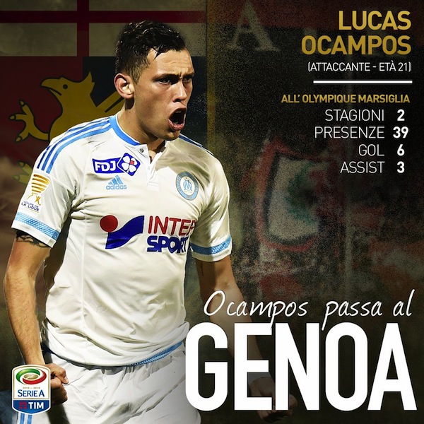Италианският клуб Дженоа взе под наем за следващия сезон Лукас Окампос от френския гранд Олимпик Марсилия, съобщават "грифоните". Тимът от Генуа има и опцията закупи състезателните права на 21-годишния офанзивен халф.