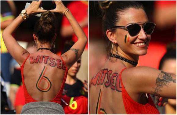 Съпругата на Аксел Витсел - Рафаела Сабо, обра овациите при победата на Белгия срещу Швеция (1:0) в груповата фаза на Евро 2016. Красивата румънка бе на трибуните и привлече вниманието на фоторепортерите с изписаните върху гърба й име на нейния любим и номера му.