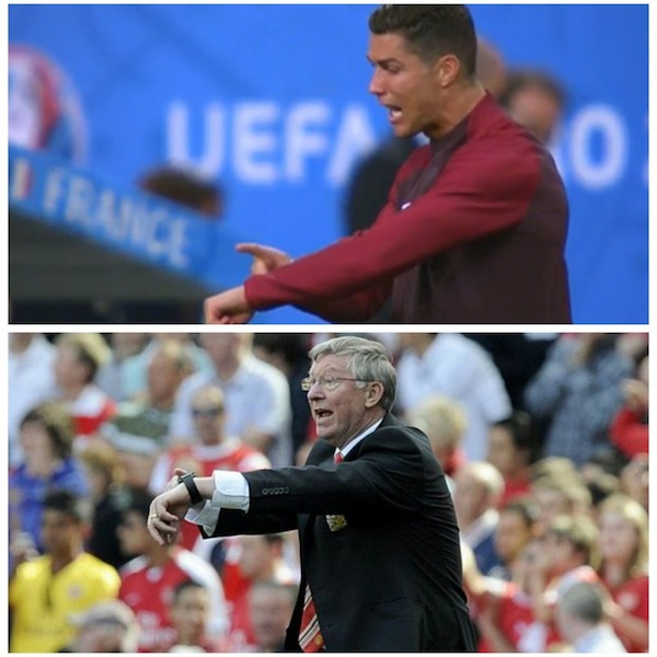 Бившият мениджър на Манчестър Юнайгед Фъргюсън изчака търпеливо на трибуните, за да поздрави бащински Кристиано, който игра на "Олд Трафорд" между 2003 и 2009 година. Преди това Фърги поздрави и Луиш Нани, който ппък носеше фланелкана на "червените дяволи" от 2007 до 2014 година.