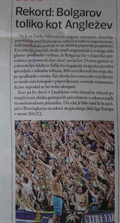 На столичани бяха отпуснати първоначално само 800 билети, което е капацитета за гостуващите фенове, а да този момент най-много привърженици на друг отбор в Марибор е имало през 2011/2012 година, когато приемат англичаните от Бирмингам. Спортният ежедневник продължава: Рекордът със сигурност е изравнен, но българите може и да го подобрят, ако продължат да идват до часа на мача.