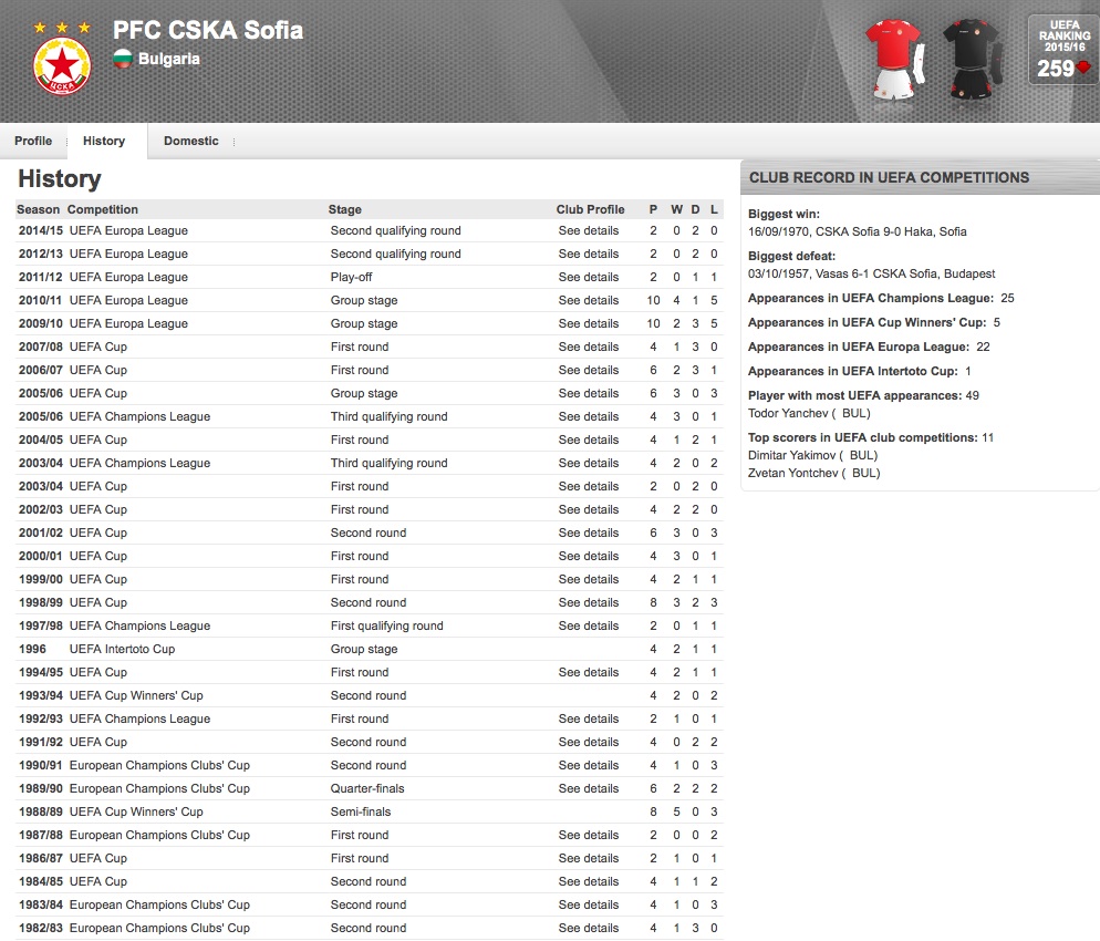 Първият е ПФК ЦСКА София, който е представен с цялата си история в евротурнирите. Т.е. към този момент УЕФА счита именно този клуб за истинския ЦСКА.